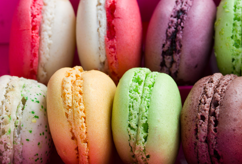 To measure by weight, use these amounts: 100 grams egg whites 50 grams white sugar 200 grams confectioners’ sugar 110 grams ground almonds?If you do not have a sifter, you can use a blender or food processor to thoroughly mix the almonds and confectioners’ sugar. Just blend or pulse for thirty seconds. Remember that because the consistency of the mix is like cake batter, you’re going to have to be quick about piping it onto the silicone mat. Hold the pastry bag sideways between piping so it doesn’t spill.