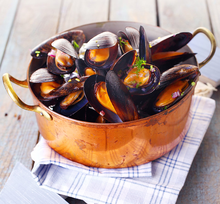 Stir the black pepper into the broth. Taste the broth and, if needed, add salt. Ladle the broth over the mussels and serve with the garlic toast.